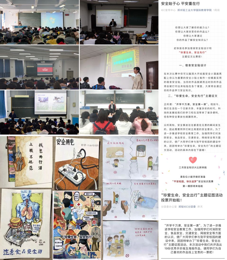 此次活动采取教育与宣传相结合、线上与线下相结合,多措并举扎实开展校园安全知识普及、提高校园安全意识。辅导员老师分年级、分专业召开安全教育主题班会,围绕交通安全、人身安全、消防安全、网络安全、校园借贷、非法传销、邪教防范等内容展开详细讲解,对于目前存在于国内高校的安全案例进行剖析,强调安全意识和安全行为的重要性;开展线上线下安全知识宣传,普及安全贴士,扩大覆盖面,切实帮助学生提高安全防范和自救能力;采取安全知识竞赛、安全教育主题征文、海报设计以及宿舍安全贴设计等多种形式,激发学生的主观能动性,在体验和参与的过程中不断提高安全意识,深化教育效果。