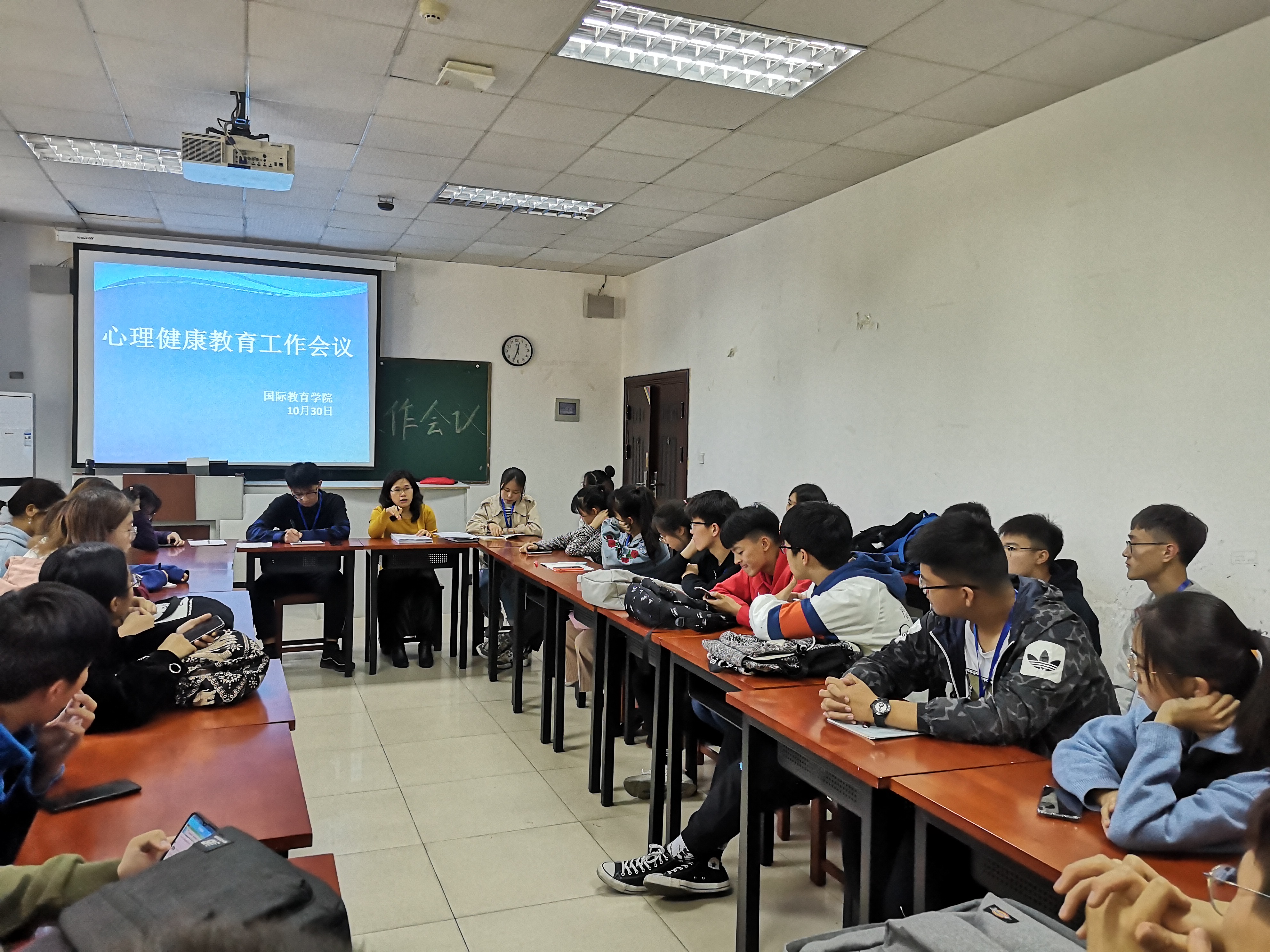1030日中午,国际教育学院在教二楼223召开了心理健康教育工作会议,心理部成员以及班级心理委员参加了此次会议。会议由心理健康教育专职辅导员贾平老师主持。