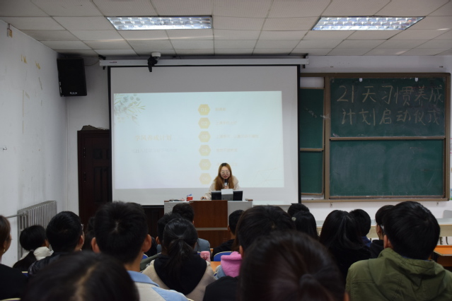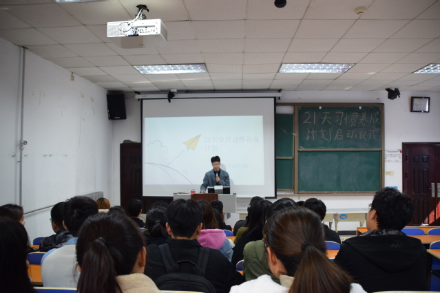 会上,焦云娜老师通过具体事例对学习管理、习惯养成在学风建设和个人成长中的重要作用进行了阐述,要求同学们加强自我管理、做好自我规划,以“21天习惯养成计划”为契机,从良好学习、生活习惯的养成做起,以实际行动带动身边的同学,为营造学院优良学风不懈努力。随后,本次活动的三位负责人分别对“优良学风养成计划”、“阅读习惯养成计划”“生活习惯养成计划”进行了详细介绍,通过课堂、宿舍等方面21天好习惯的坚持,帮助同学们提升精神面貌,成为最好的自己。