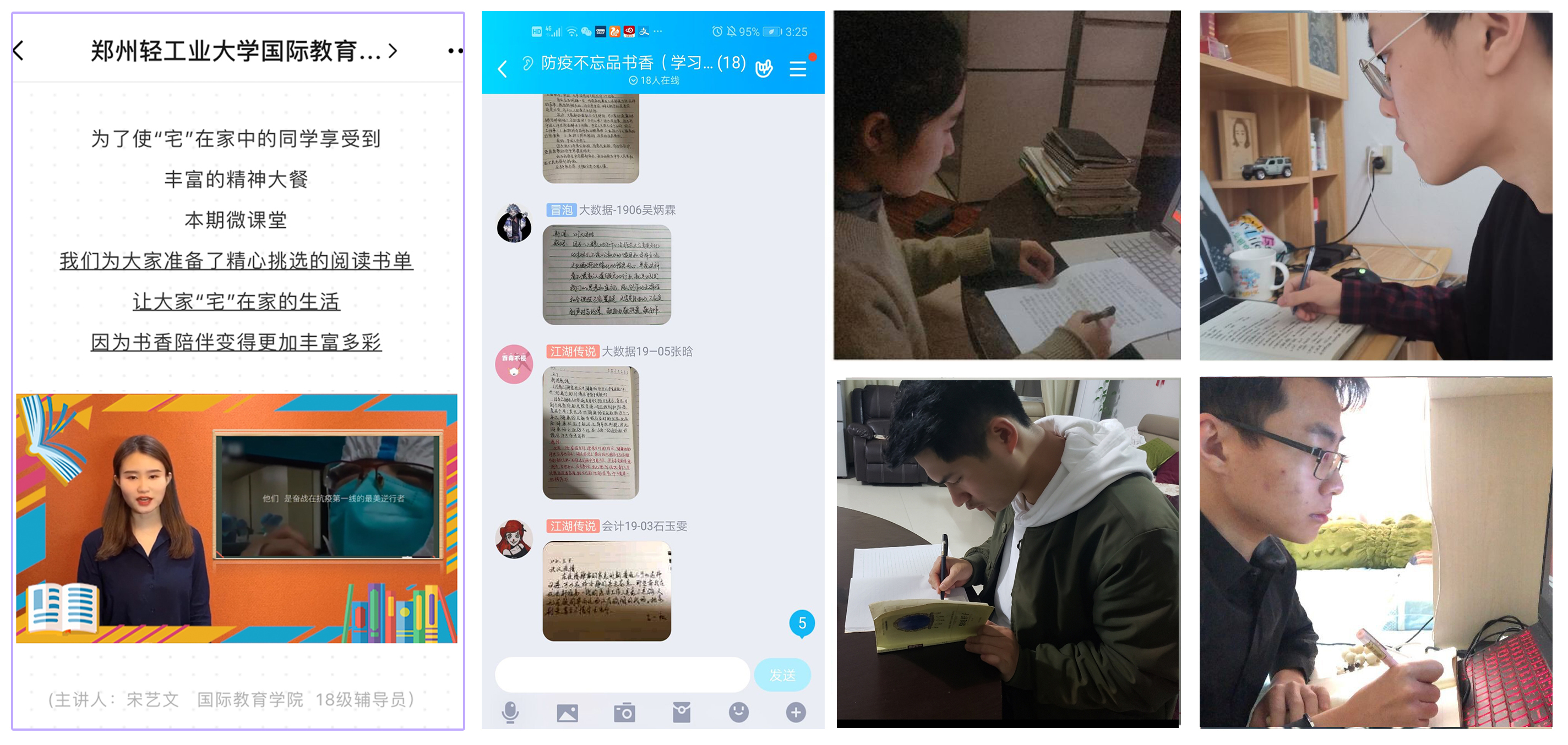 国际教育学院微课堂系列是用贴近大学生生活和学生喜闻乐见的网络内容利用新媒体形式开展的网络思政育人工作,意在潜移默化中培育大学生的爱国情怀。本期微课堂由辅导员宋艺文老师为同学们推荐阅读书单,并发起“防疫不忘品书香”线上读书打卡活动,带领同学们在防疫之旅中品味书香。此活动充分利用线上平台特点,建立以班级为单位的小型读书群和每日一看专项渠道。在读书活动中,同学们纷纷捧起书本,从书中汲取知识和力量,并积极书写读后感在线上与同学分享阅读感悟;在每日一看活动中,号召广大学生准时准点观看早间新闻,新闻联播,新闻快车等多项节目,让同学们在观看阅读中学习科学知识,了解疫情,懂得敬畏生命,坚定战胜困难的信心和勇气。