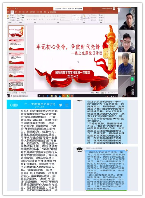 疫情期间,为引导广大党员坚定理想信念,充分发挥党支部的战斗堡垒作用,国际教育学院本科生第一党支部于4月2日开展了以“牢记初心使命,争做时代先锋”为主题的线上党日活动。
