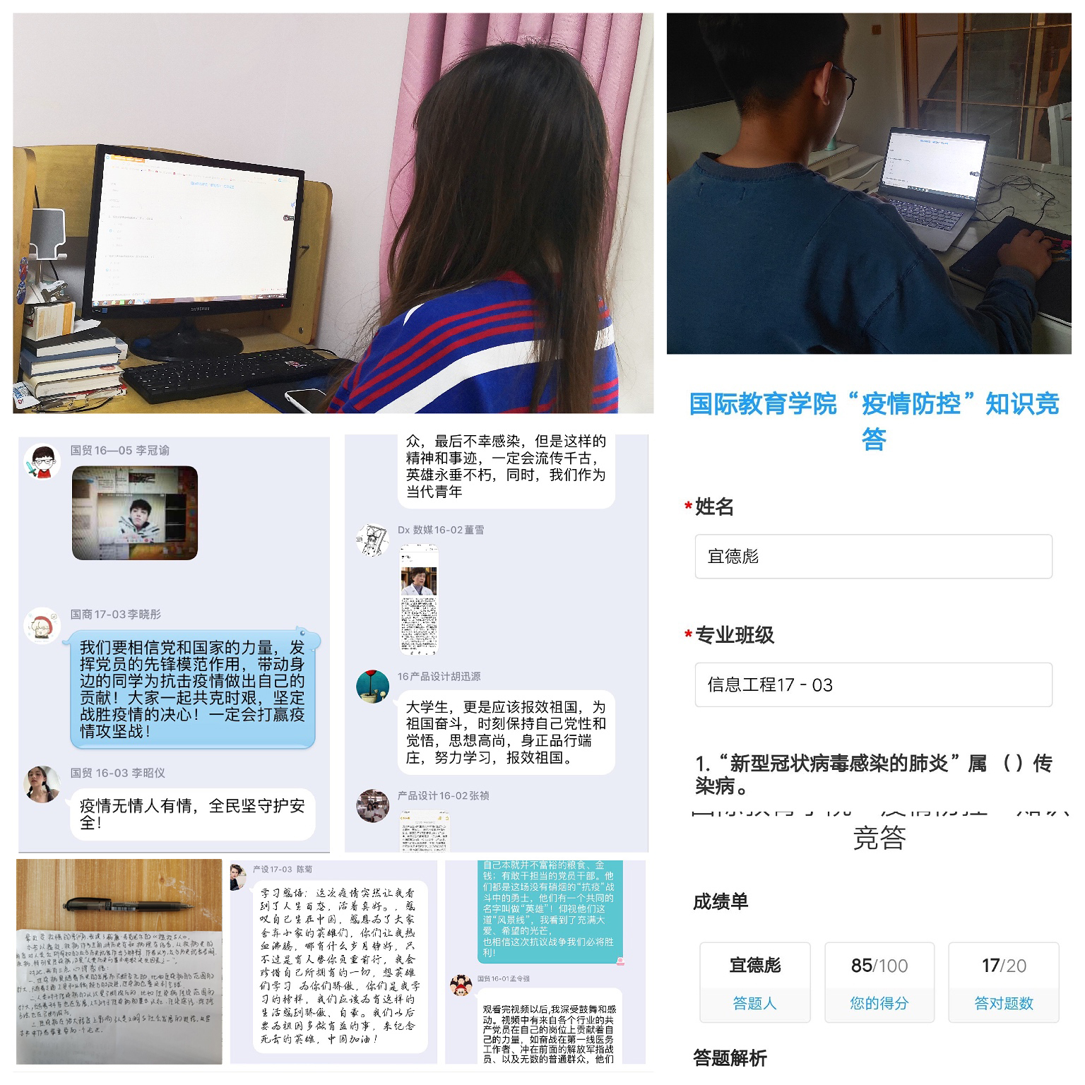 新冠肺炎防控知识竞答如期展开,各班团员干部协力组织,大力宣传,号召各班同学积极参与,竞赛题目紧密结合疫情防控信息,包括国家政策、重要指示、病毒性质和预防手段、甄别谣言等多个方面。参加防疫知识竞赛前,各班级通过线上形式组织开展团日活动,学习新型冠状病毒肺炎相关的疗诊知识。竞赛答题结束后,同学们展开了激烈的讨论,在学习的过程中交流,强化了对新型新冠肺炎防控知识的掌握,让同学们对新冠病毒有了更加深层的认识,知识竞赛取得良好成效。