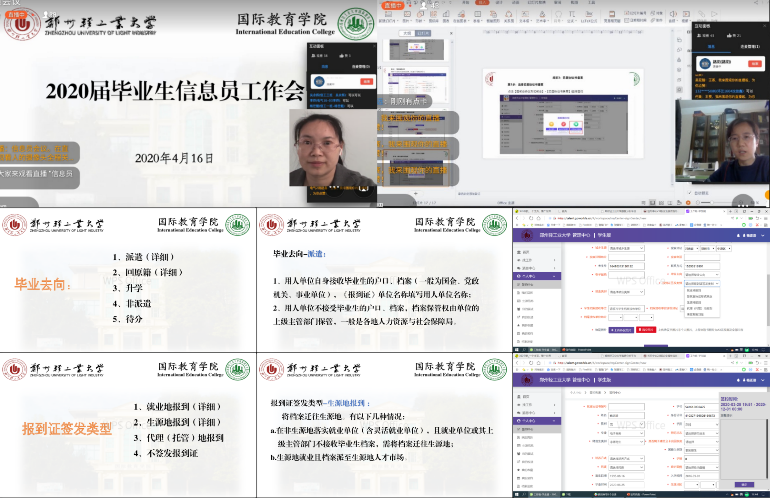 为帮助疫情影响下的2020届毕业生积极就业,4月16日下午,国际教育学院通过线上网络会议平台召开2020届就业班级业信息员工作会议。学院党委副书记李锐杰老师、学生工作办公室主任路阳老师、毕业班辅导员和全体毕业生班级就业信息员参加了本次会议,会议由就业专职王赛老师主持。