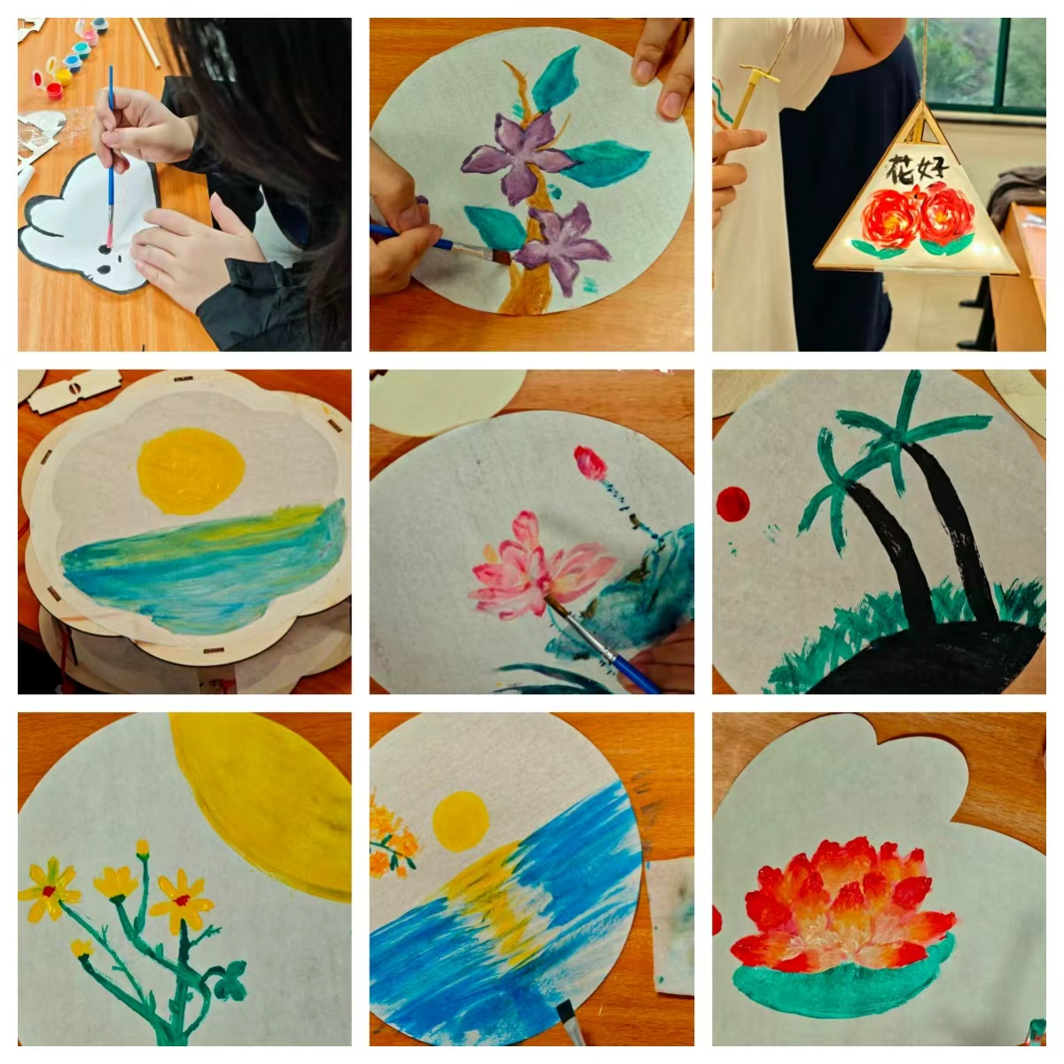 活动中,同学们围坐在一起,或参照中秋元素图样构思,或发挥创意自由创作:有的用柔和的色彩勾勒出玉兔灵动的姿态,搭配桂花枝丫点缀,尽显中秋浪漫;有的将明月、祥云与家人团聚的场景融入画中,笔墨间满是对团圆的向往。大家手持画笔细细描摹,时而交流创作灵感,时而互相帮忙调色,空白的灯笼在欢声笑语中逐渐变得色彩斑斓、意蕴满满。
