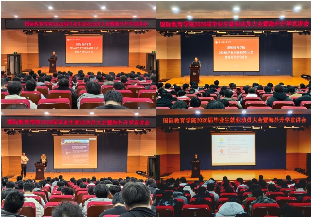 10月28日下午,国际教育学院在教一楼演讲厅召开2026届毕业生就业动员大会暨海外升学宣讲会。学院党委书记高建奇主持会议,院长金楠作动员讲话,意大利卡梅里诺大学代表团成员参会作海外升学宣讲。学院党委副书记李锐杰、就业专职老师、毕业班辅导员和全体毕业生参加大会。