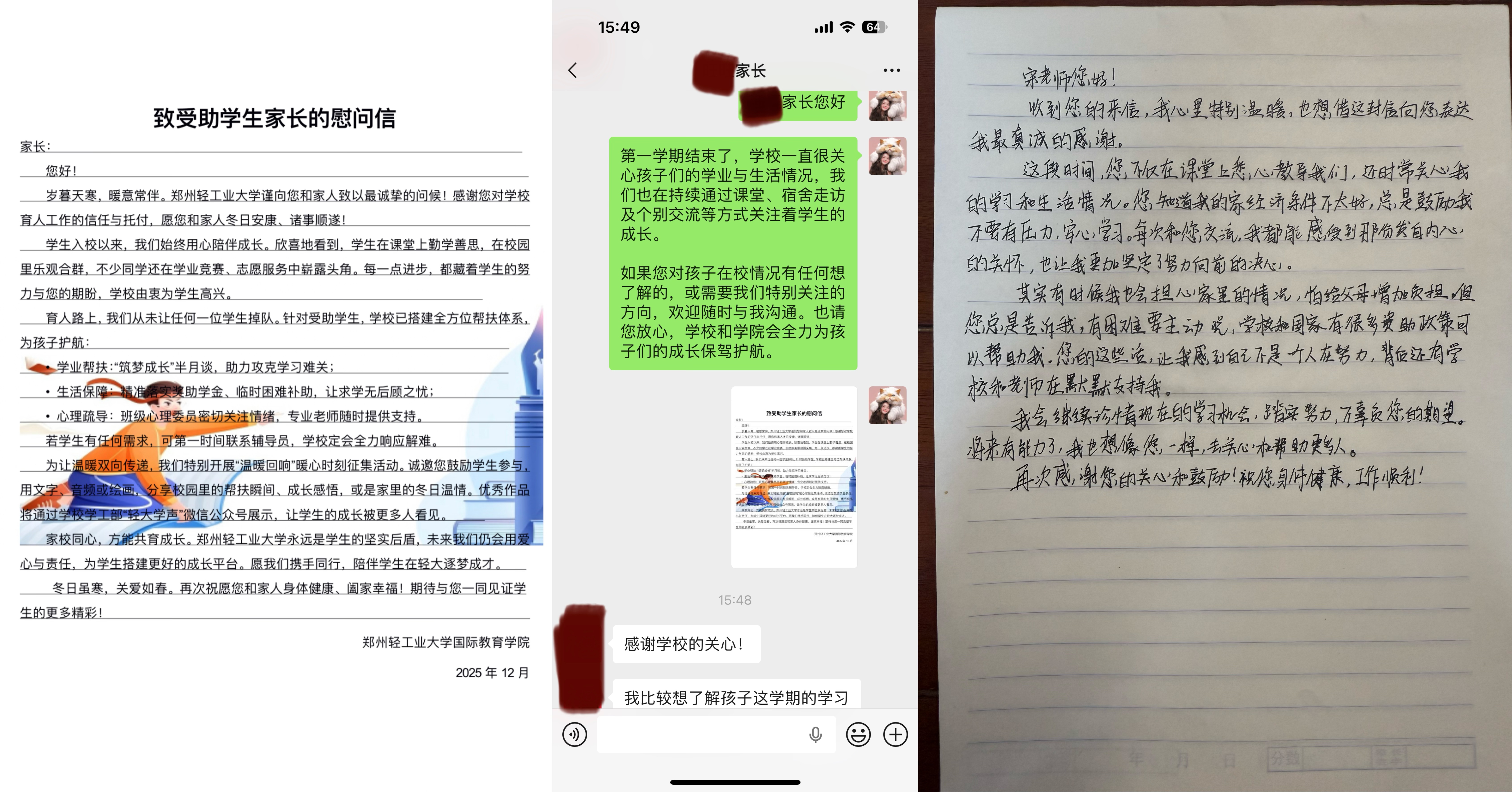 “亲爱的家长,您好!见字如面……”在“书信寄情”活动中,学院辅导员为受助学生家庭发放慰问信件。信中不仅如实反馈学生在校表现,更表达了学院对其努力奋进的充分肯定和未来发展的殷切期望。许多家长在收到信后深受感动,纷纷通过微信、电话等方式表达谢意,表示将一如既往支持学院工作,配合学校共同助力孩子成长成才。
