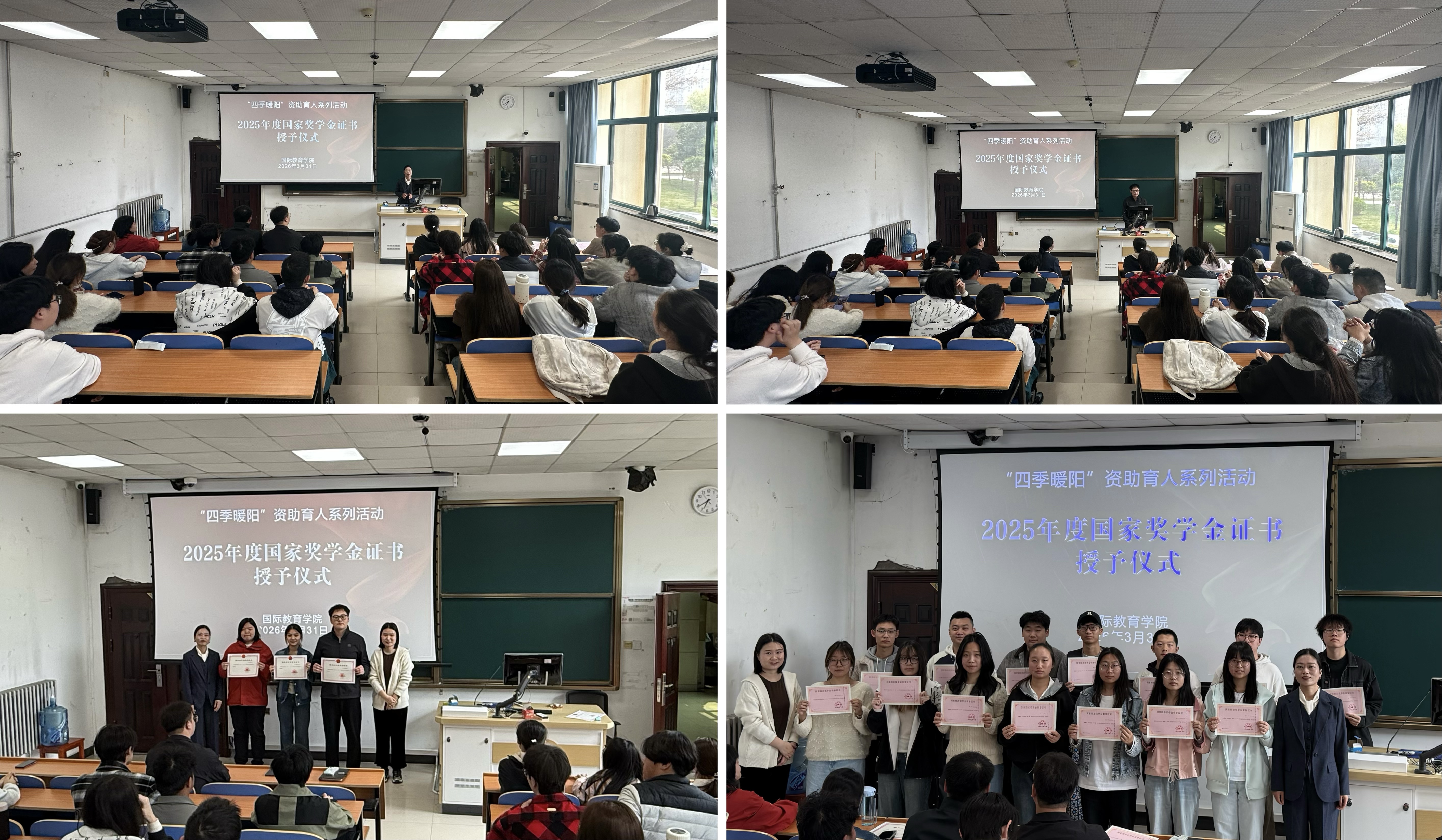 3月31日上午,国际教育学院于教二楼229室举行2025年度国家奖学金荣誉证书授予仪式。学院党委副书记张智勤、各年级辅导员及获奖学生、学生代表共同参加本次活动。