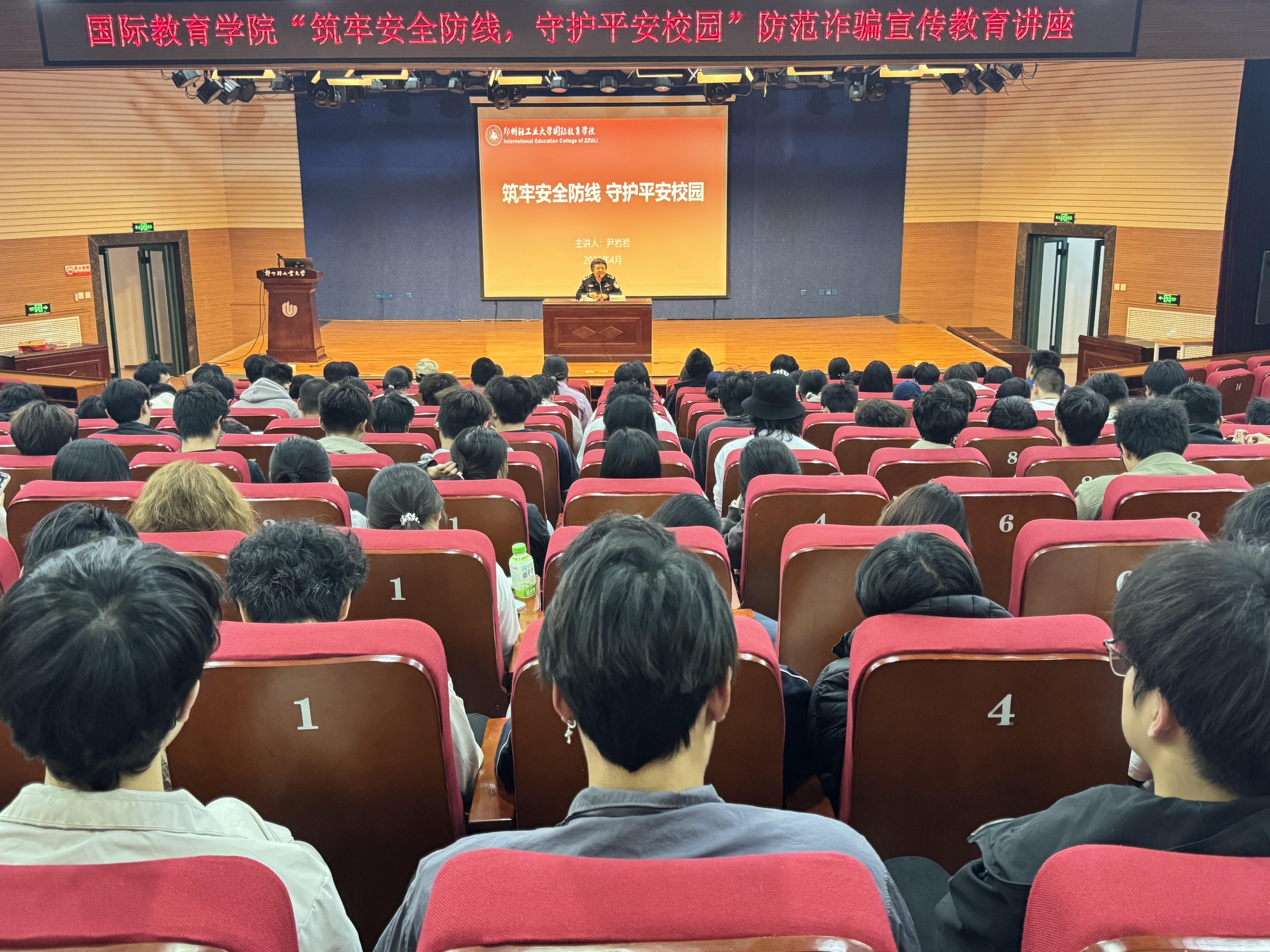 为切实增强学生的安全防范意识与能力,筑牢校园安全屏障,4月2日下午,国际教育学院在教一楼演讲厅举办校园防诈骗宣传教育讲座。学院特邀金水区东风路派出所尹岩岩警官担任主讲,2024级、2025级全体学生参加。