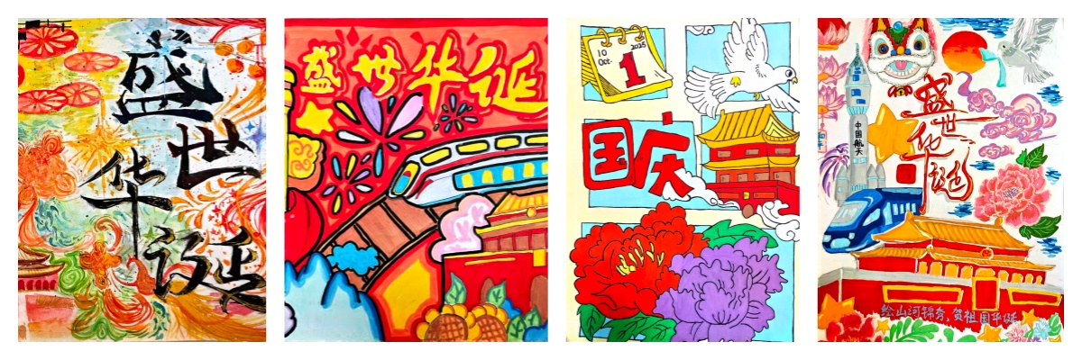 活动期间,同学们热情高涨、积极参与,将对祖国的热爱熔铸于色彩与线条之间。有的作品以浓墨重彩勾勒长城蜿蜒、黄河奔腾的壮美河山;有的作品以飘扬的五星红旗晕染出热烈的红色,尽显对祖国的赤诚热爱;还有作品以“我爱你祖国”为主题,生动铺陈出祖国繁荣昌盛的盛世图景。每一笔细致勾勒、每一抹鲜活色彩,都蕴藏着同学们对祖国山河之美、文化之厚的自豪,更传递着对祖国的深情祝福。