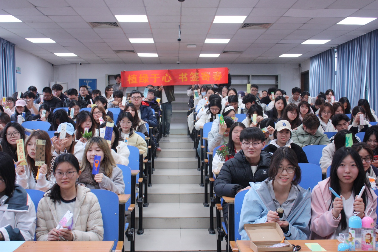 活动现场,同学们以环保卡纸为底、流苏为缀,或执笔描绘草木花卉,将盎然春意凝于笔端,或写下真挚的环保寄语,将对自然的热爱与对绿色生活的向往,细腻地融入方寸之间。一件件精巧别致的书签作品,既展现了同学们的动手能力与审美情趣,也传递着节约资源、爱护自然的环保理念。活动过程中,每位同学都领取了一盆鲜活绿植,将春日生机与环保初心一同带回日常。这一盆盆绿意,与自制书签的春日寄语相互呼应,使绿色理念从艺术创作延伸到生活实践。活动尾声,同学们手持自己制作的书签,满怀成就感地合影留念,用镜头定格下这份美好瞬间,也为这场春日里的绿色之约画上了圆满而温馨的句号。